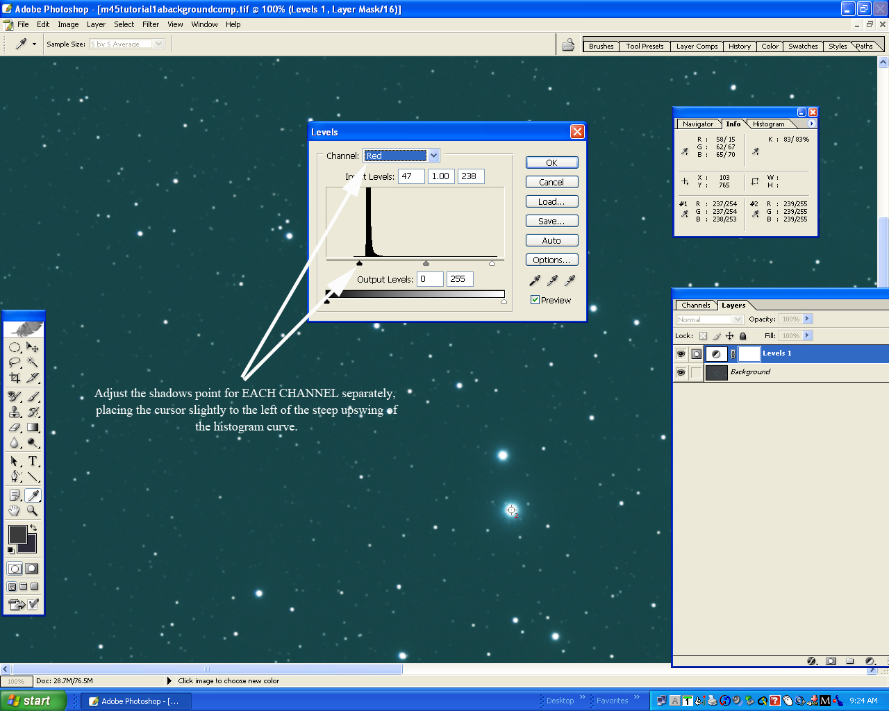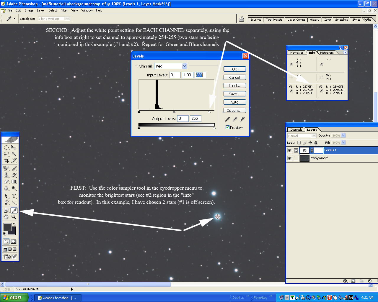 Layer, Levels." For each channel, move the white point cursor